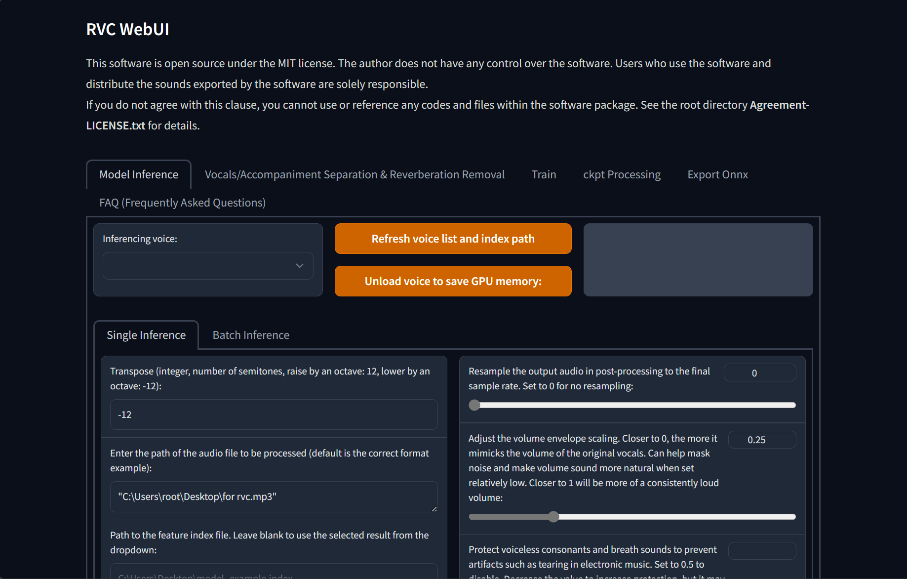 - 使用最先进的人声音高提取算法InterSpeech2023-RMVPE根绝哑音问题。效果最好(显著地)但比crepe_full更快、资源占用更小
